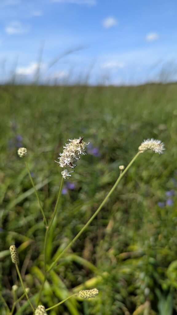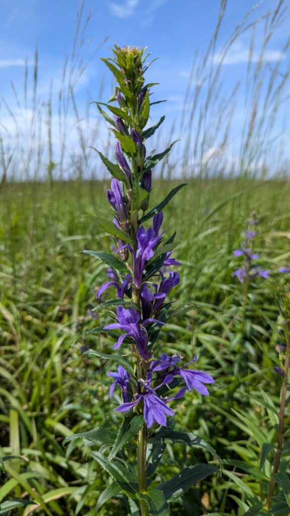 紫色の花は「サワギキョウ」で、白くてもこもこしているのは「ナガボノワレモコウ」という名前。